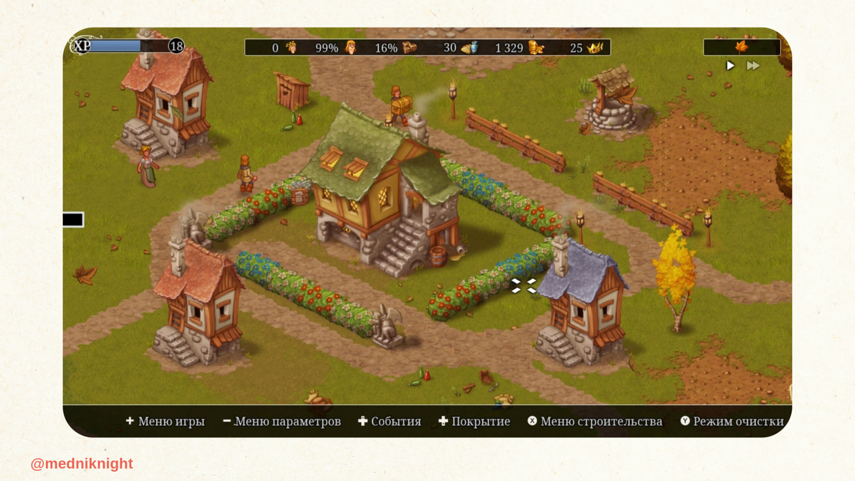 Внешний вид домиков, жителей в разных костюмах, иконки — дизайн не кричит тебе в экран «Тут уютно!», как некоторые игры жанра cozy. Вместо этого Townsmen предлагает красоту и эстетическое наслаждение без намерения эксплуатировать тягу уставшего геймера к чему-то расслабляющему. Даже те сценарии, которые позиционируются как истории с низким уровнем сложности, потребуют от вас тщательного выполнения рутинных задач и постоянного масштабирования. Отложить в сторону геймпад и позволить городу разбираться со своими проблемами самостоятельно не получится. Такой подход кажется мне прозрачным и честным.